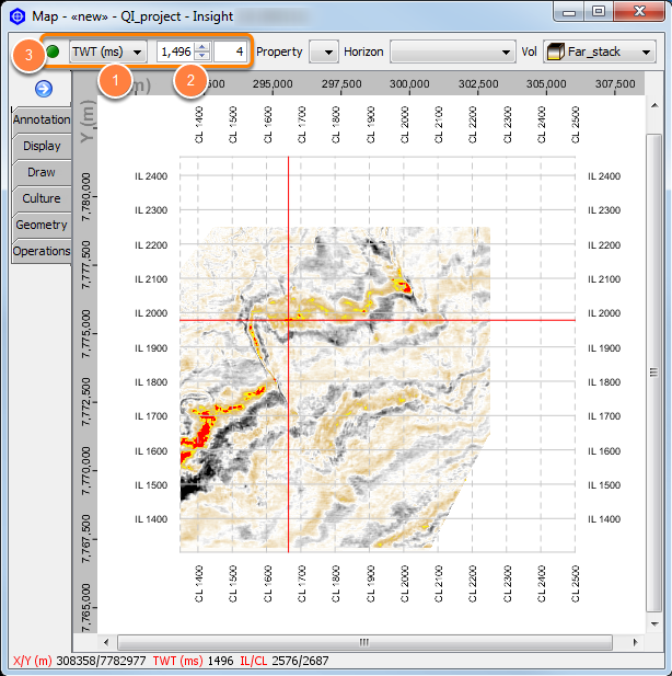 - Toggle the "traffic light" icon green to enable display of the time/depth slice.