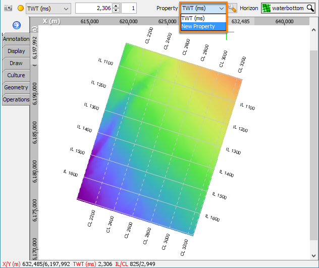 For example, 50 ms above means 50 ms shallower than the horizon. 50 ms below means 50 ms deeper than the horizon. - At Property, choose the horizon property to be displayed. This option is tied to the Property in the Map View's navigation bar. Depending on the property you have selected, different calculation methods will be used to calculate the horizon value (for a definition of the properties, or to create a new property, see Using Horizon Properties).