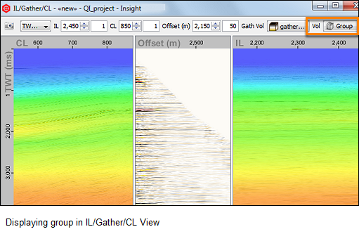 The example shows an IL/Gather/CL View. In the left and right panels, the velocity is displayed with the full stack and gather volumes. In the middle panel, the section view of the gather volume is displayed.