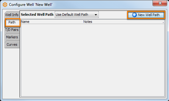 1. Open the Path tab in the Configure Well window. This window is displayed once you have saved the general well information.