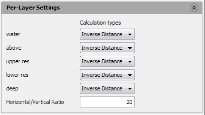 In the Per-Layer Settings section, select the calculation type to be used in each layer in the windowing model. Available options include Inverse Distance and Average of well values.