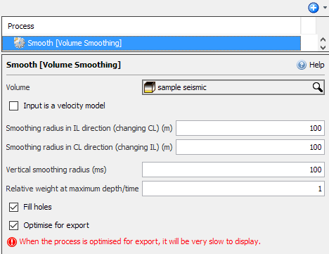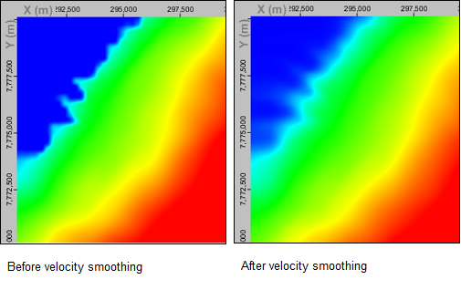 - Select the Input is a velocity model check box if the selected input volume is a velocity volume. For a velocity volume, the process will smooth the volume in slowness (1/v) space. This check box is automatically selected if you have selected an input volume with a velocity class assigned to it. It will not be legitimate if the volume contains zero values.