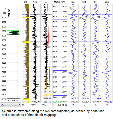 After you have configured the synthetics for the angle stacks and defined the log curves, the synthetics and seismic traces (blue and black lines) will be displayed in the Synthetics–Seismic Panel.