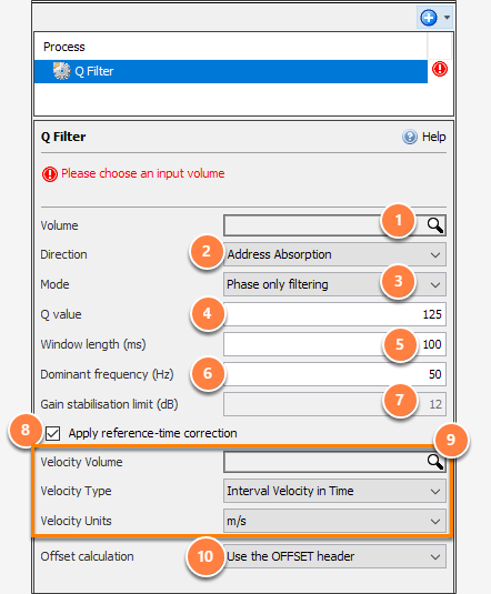 - Input is moveout corrected: If the input is already moveout corrected (e.g after NMO or migration) then Q filter will remove this correction using the supplied velocity model, apply the Q filter, then re-apply moveout.