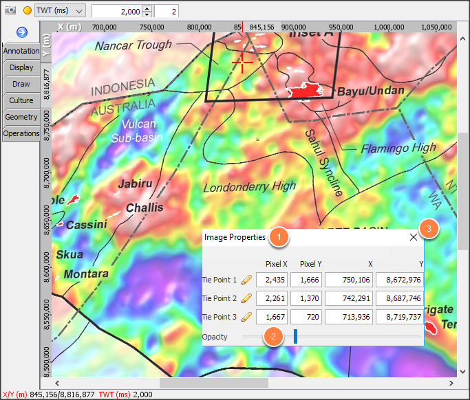 To be positioned and scaled correctly in the map view, the image coordinates (in pixels) must be related to map coordinates (in UTM X/Y). Three tie points are required:
