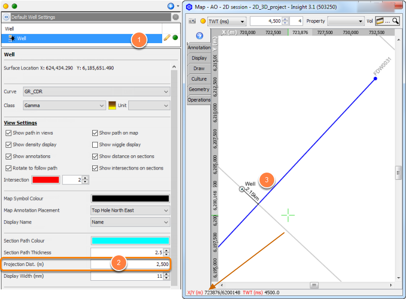 The well Projection Distance controls how far away a well can be displayed from a section view. Choosing larger values includes the well on more distant IL/CL or arb lines. Smaller values will only include the well on very close IL/CL or arb lines.