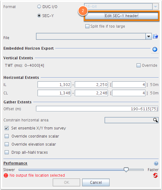 - Select SEG-Y as the Format and click the Edit SEG-Y header button.
