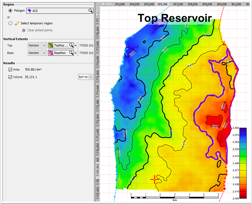 To calculate the volume, add a top and base boundary extent. You can enter values directly or choose interpreted horizons - or a combination of both. It’s easy to investigate the effect on volume of different contact depths by adjusting the values.