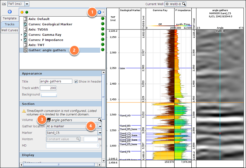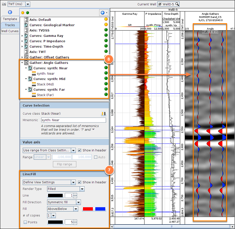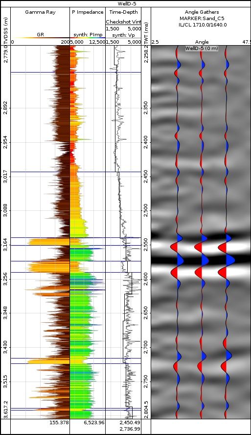 In just a few clicks, we’ve added a seismic track containing the Mid stack and copied the mid-stack synthetic track from the gathers.